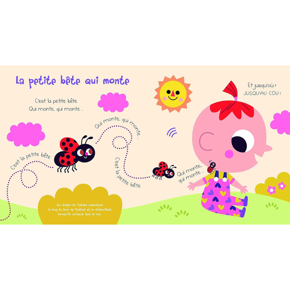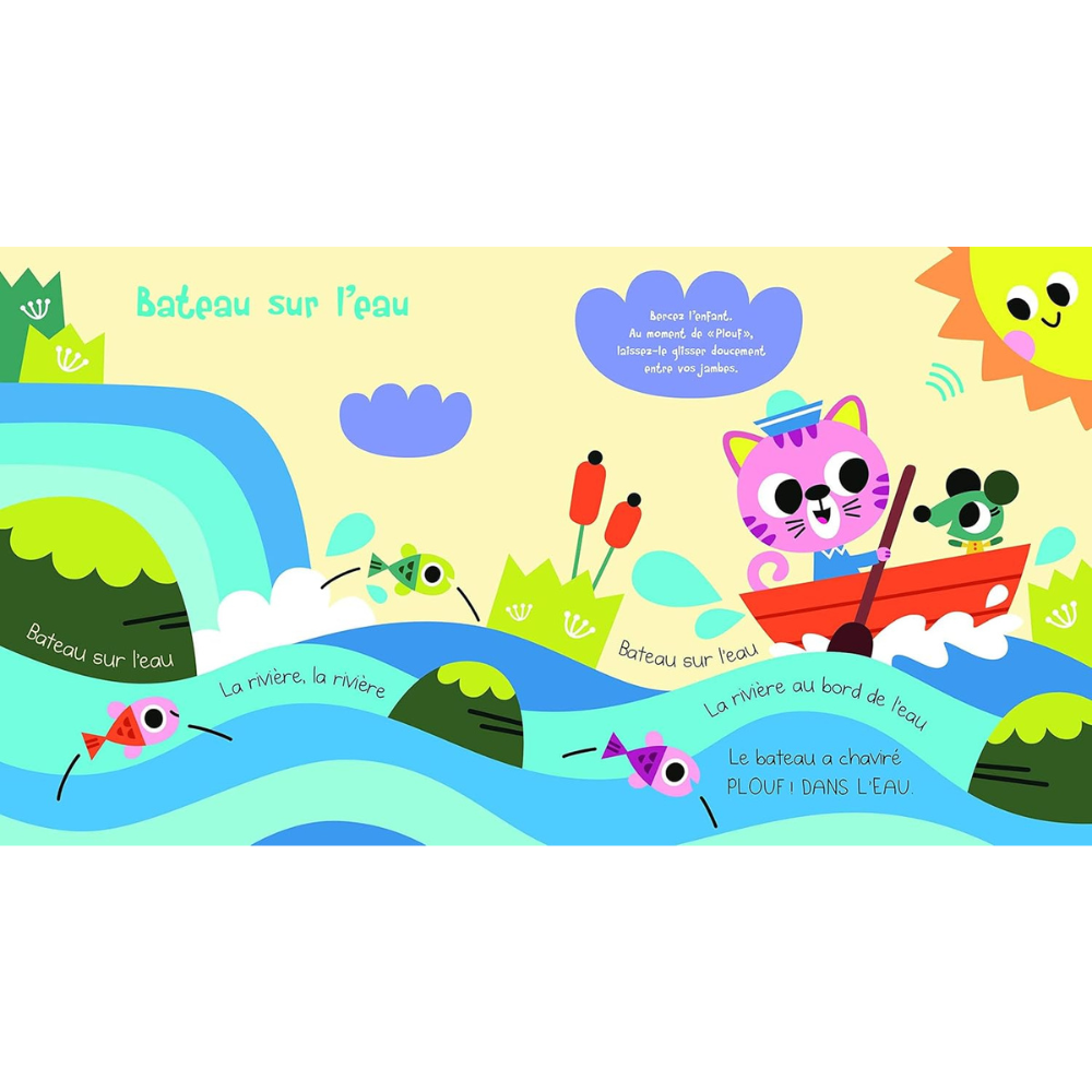 Ils joueront ensemble avec : " C'est la petite bête qui monte " ; " Bateau sur l'eau " ; " Les petites marionnettes " ; " Une souris verte" ; " Que fait ma main " et " Tourne, tourne petit moulin ". Les illustrations joyeuses de Tiago Americo se mêlent aux mots pour créer des images tendres et ludiques. Une note pour les parents indique comment jouer avec la comptine et éveiller l'enfant en musique !