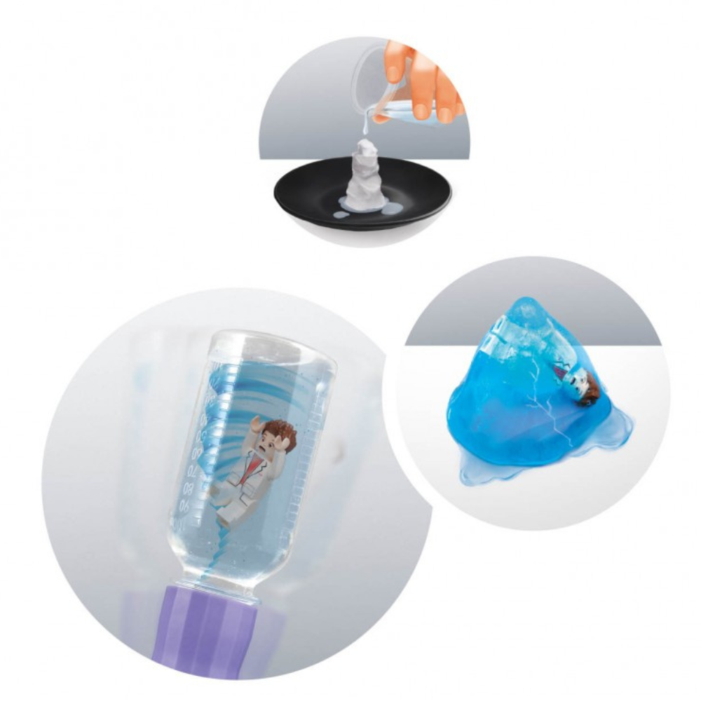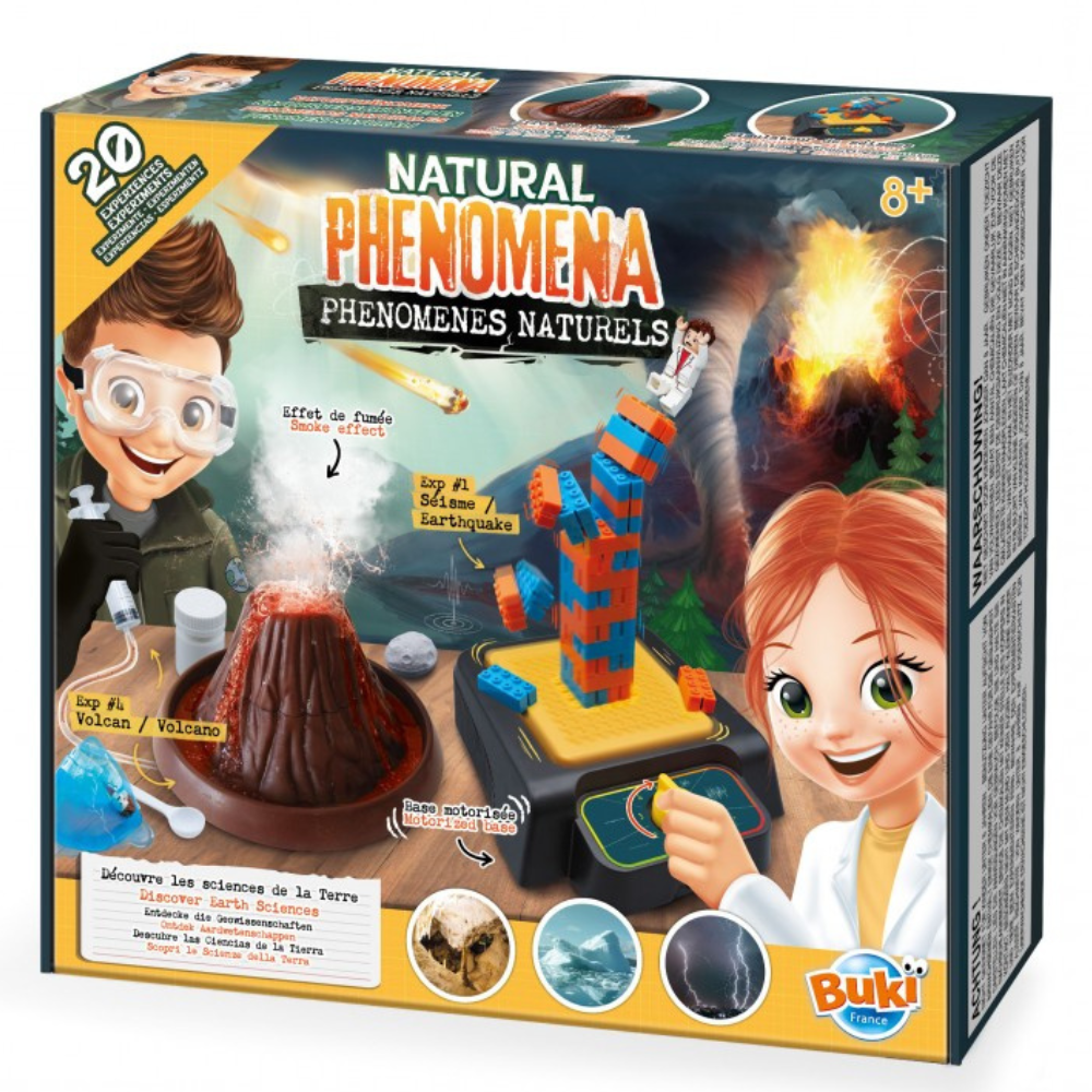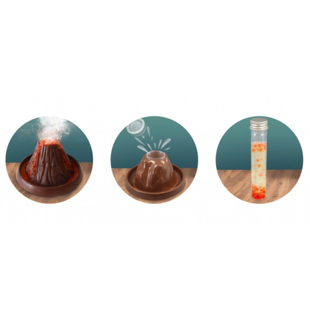 Inclus :  volcan électronique, tuyau, seringue, maquette de volcan, 60 g de sodium, 50 g d'acétate de sodium, colorant rouge (10 ml), colorant bleu (10 ml), poudre à slime (7 g), papier pH, grand récipient, 2 petits récipients, bécher avec couvercle, mousse de protection, verre doseur de 100 ml, 2 bouteilles, cuillère doseuse, tube vortex, agitateurs (x2), papier filtre, pipette, moule à iceberg, entonnoir, météorite effervescente, simulateur de tremblement de terre, 40 briques, figurine de Leo, tube, miroir, lunettes de protection, guide des nuages, poster de carte du monde et 1 notice illustrée.