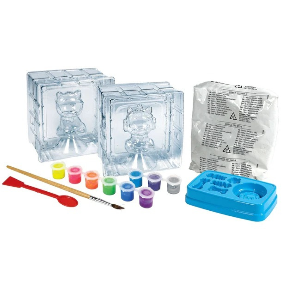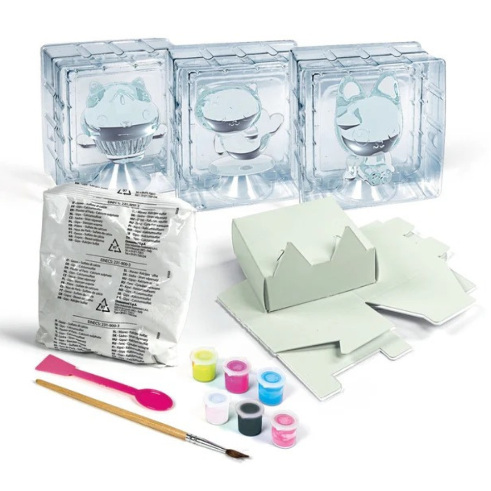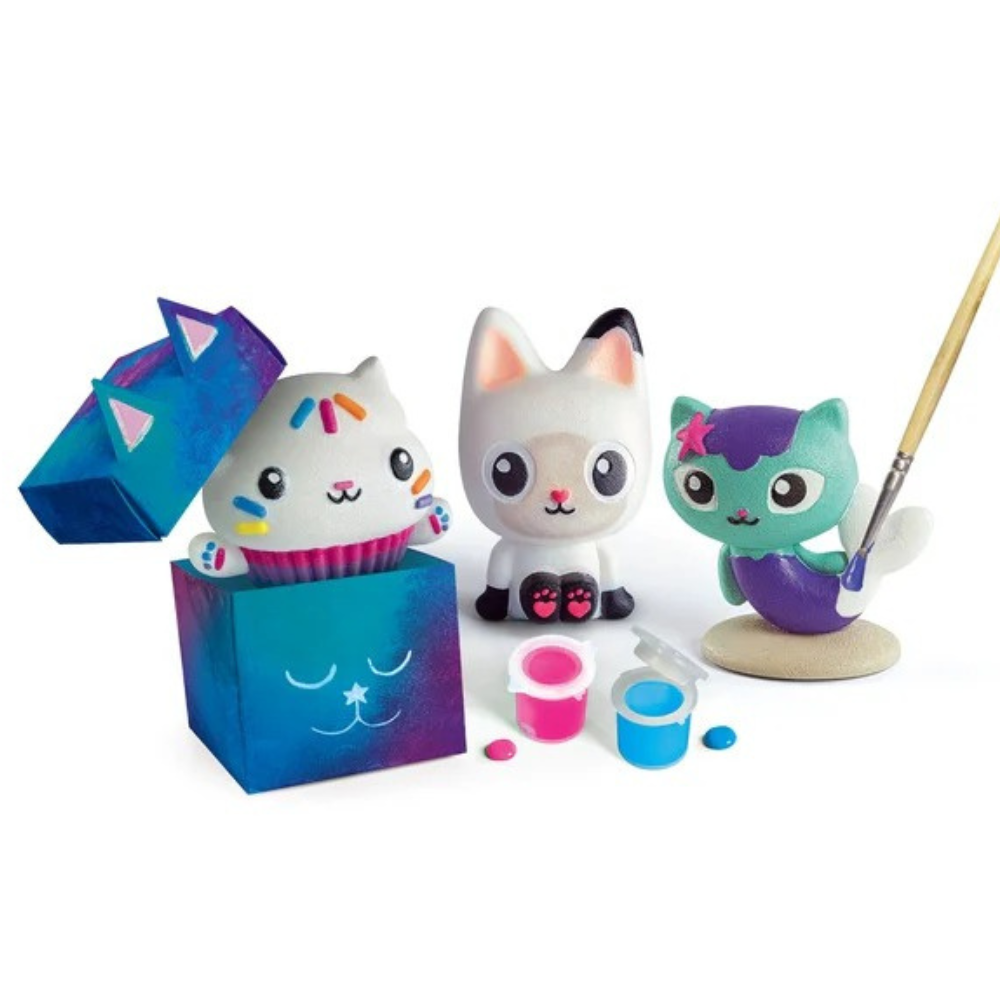 Le coffret comprend des moules, du plâtre et des petits pots de peinture pour réaliser et décorer les sculptures avec les personnages de Gabby et la maison magique.