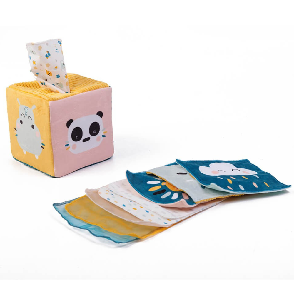 Grâce à ce jouet, en plus de s'exercer à ranger et à sortir les mouchoirs de la boîte, les enfants apprendront à reconnaître les couleurs et à explorer différentes textures et sons. La boîte elle-même présente diverses textures et illustrations d'animaux pour enrichir leurs moments de jeu.