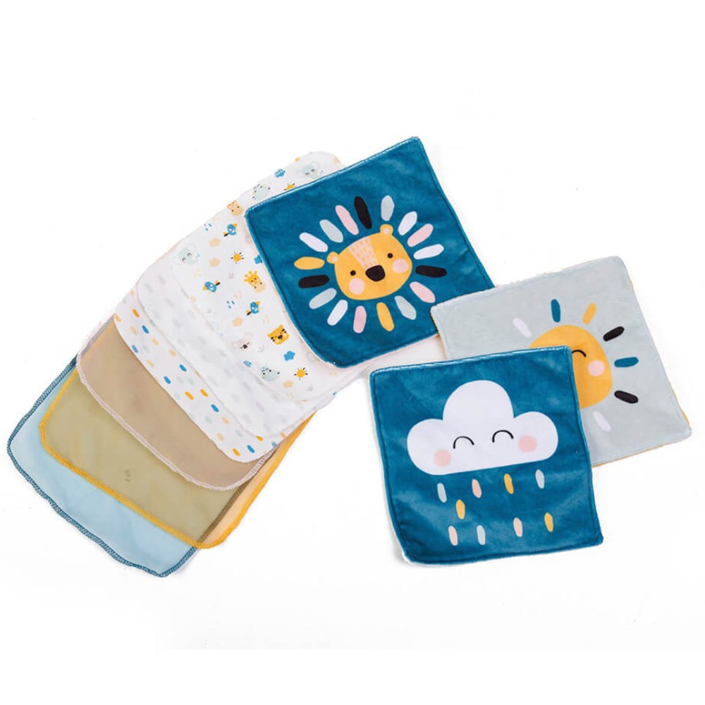 - Contient 9 mouchoirs : 3 mouchoirs en tissu imprimé, 3 mouchoirs en organdi doux et 3 mouchoirs illustrés au toucher velouté avec un bruit de papier froissé.