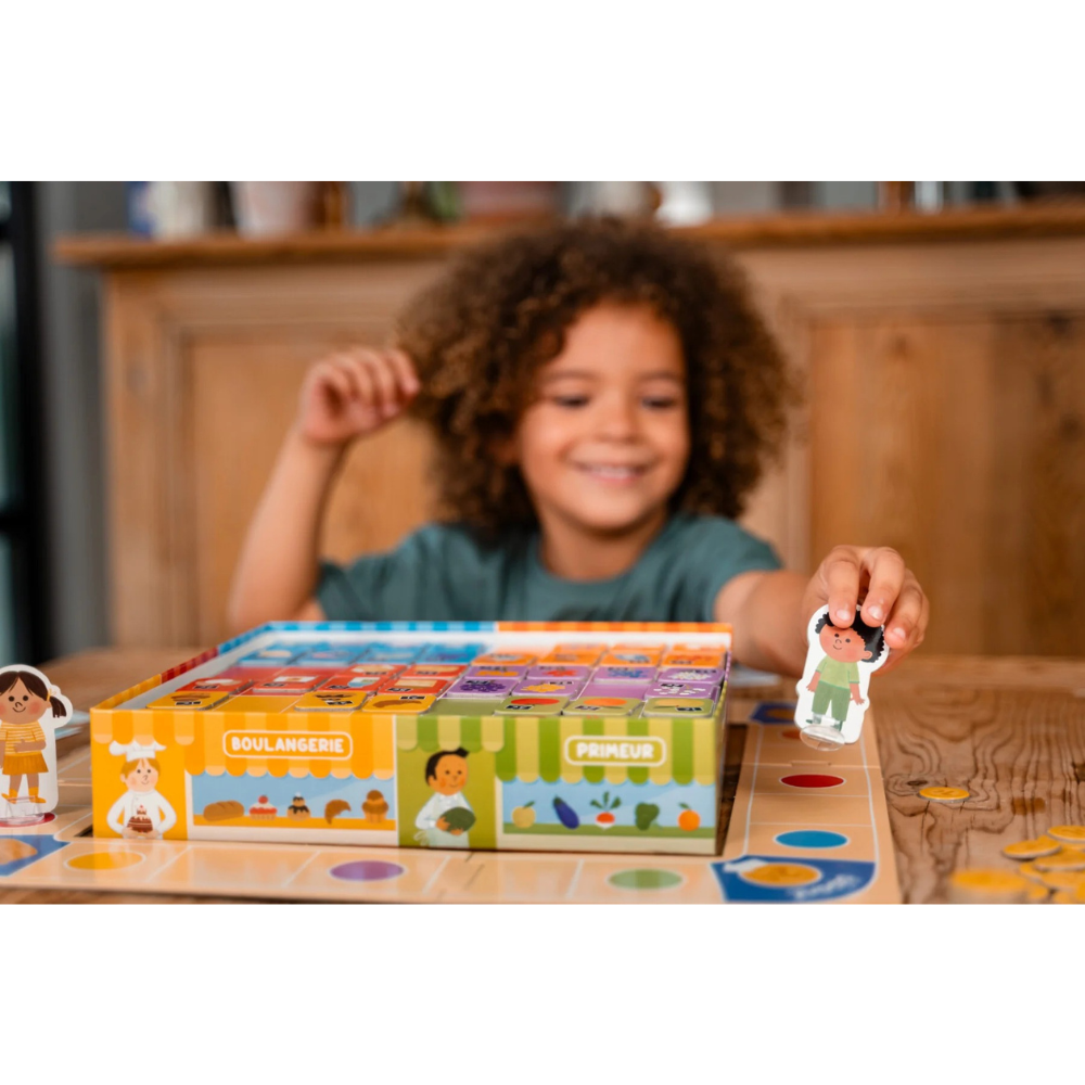 Un joueur tient la caisse, et les autres, munis de 16€ devront réaliser tous leurs achats en déjouant les pièges (tirelire cassée) !