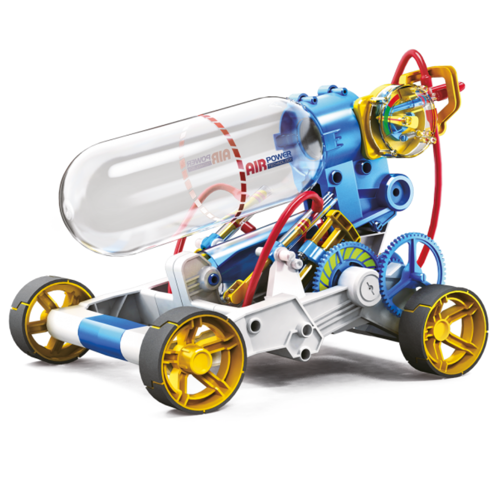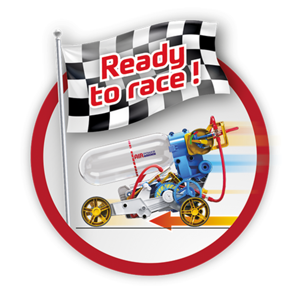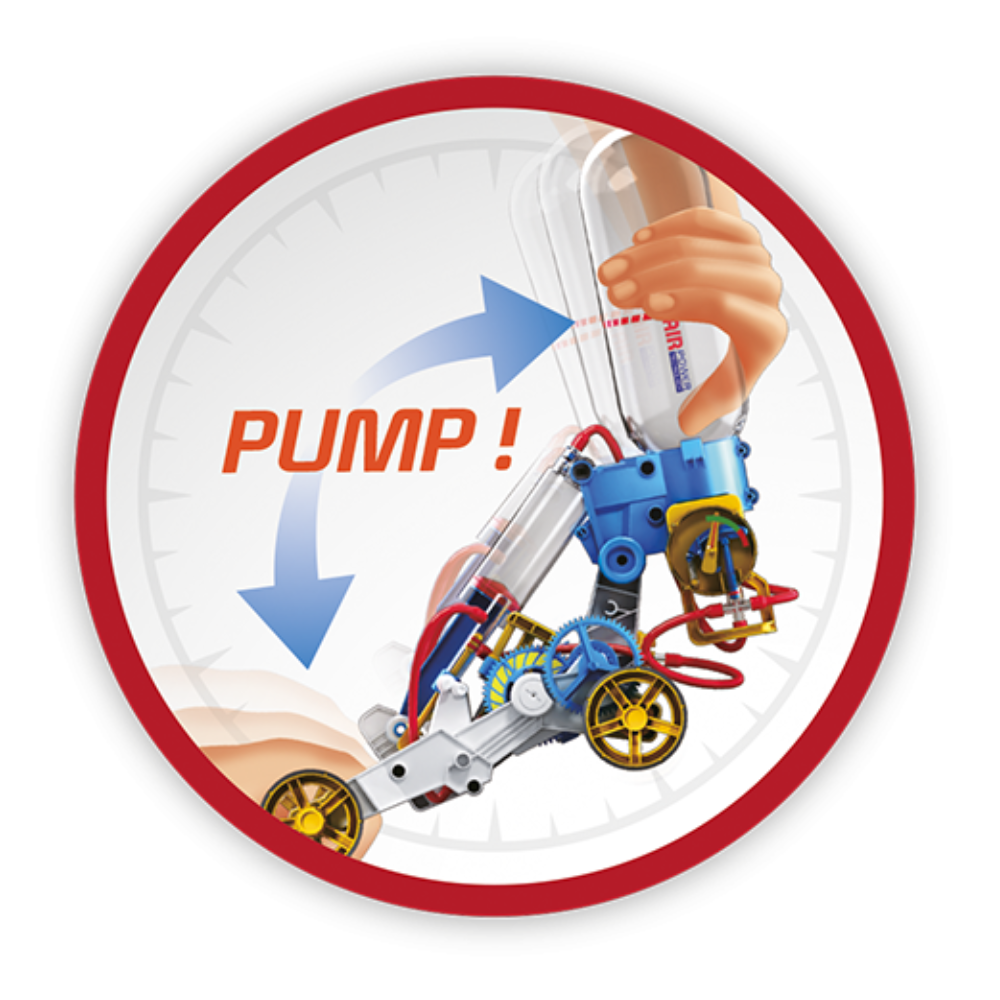 Assemblez les pièces et construisez un véhicule propulsé par air comprimé. Il suffit d'utiliser la pompe pour remplir le manomètre d'air comprimé. Lorsque le voyant est vert, le véhicule est prêt à démarrer !
