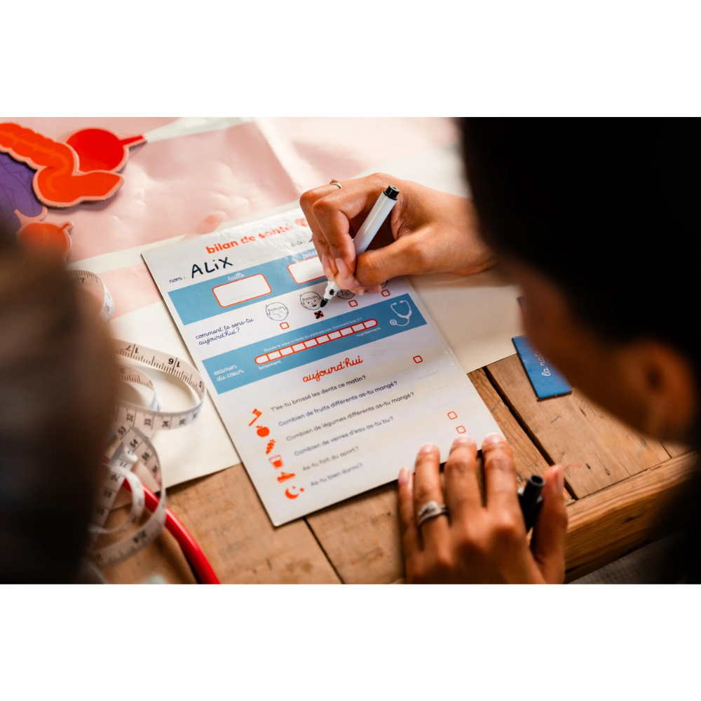Contenu : 15 grandes cartes, un grand poster (110 x 50 cm), 16 organes, 14 étiquettes, une fiche effaçable « bilan de santé », un feutre, un mètre mesureur, un stéthoscope et un guide en couleur.