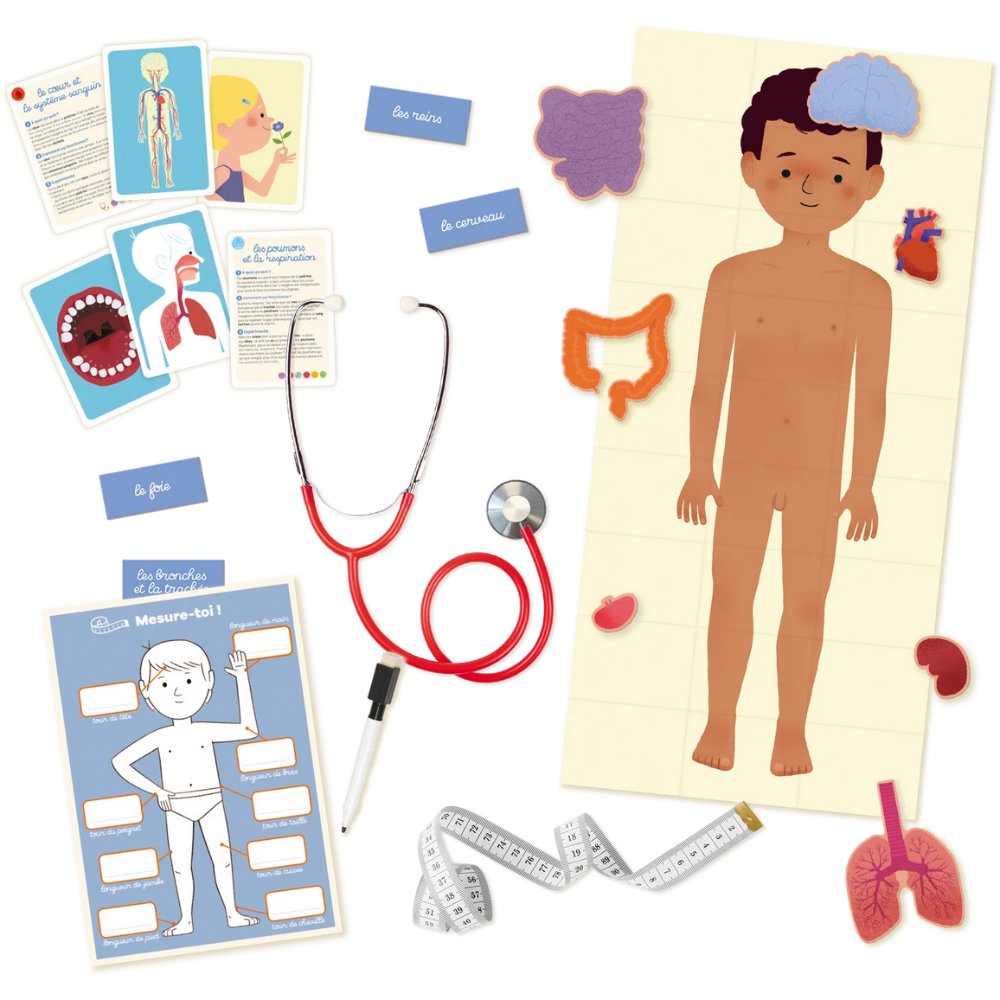 Grâce au poster à taille réelle, il place les organes et découvre comment fonctionne son propre corps. Un jeu qui permet aux plus jeunes d’intégrer leur schéma corporel et de répondre aux questions des plus grands sur le fonctionnement du corps humain. Au total c'est plus de 20 activités à partager en famille.