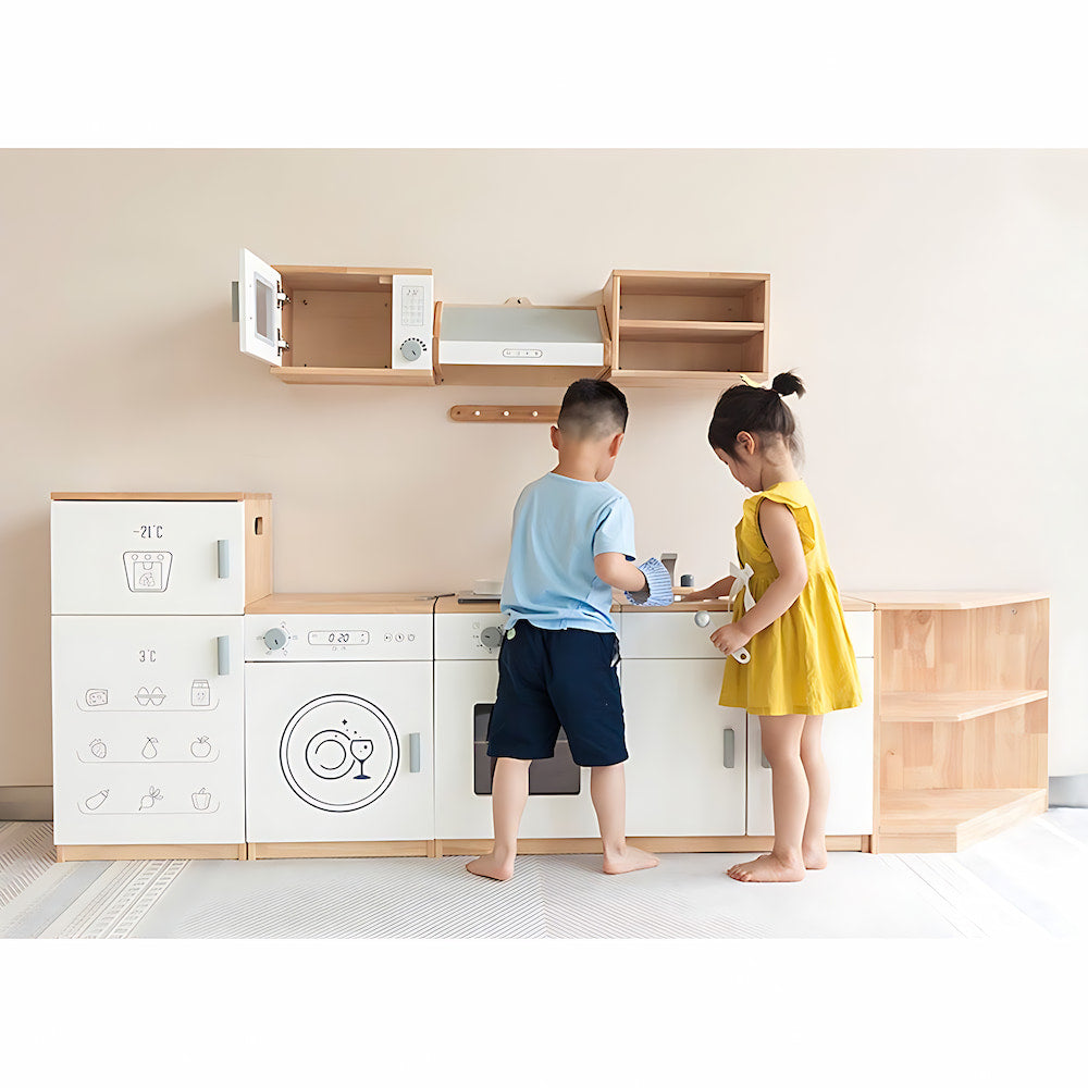 Ce micro-onde élégant est parfait pour les activités ludiques de vos enfants, leur permettant d'interagir et de jouer à la cuisine tout en développant leur imagination. La hotte aspirante intégrée permet de simuler la cuisine, ajoutant une touche de réalisme à leurs jeux. Les étagères murales fournissent un espace de rangement pratique pour vos ustensiles de cuisine et autres accessoires, favorisant ainsi l'organisation et le rangement.